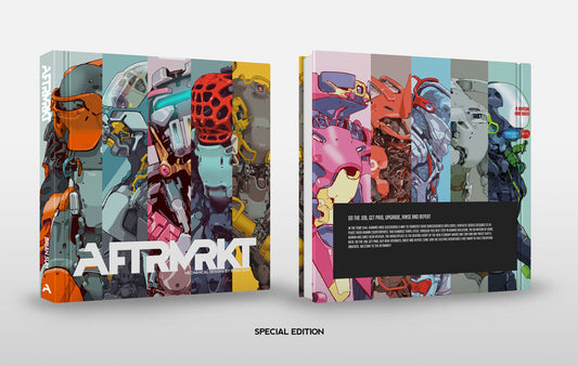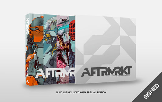 mechs. His book AFTRMRKT is finally ready to launch after over 8 years in the making. The artbook is a 152 page hardcover artbook consisting of hundreds of mechanical designs ranging from mechs, vehicles, weapons and gear all centered around a colorful futuristic cyberpunk universe. Available in the Standard Edition or the Special Edition with Slipcase.